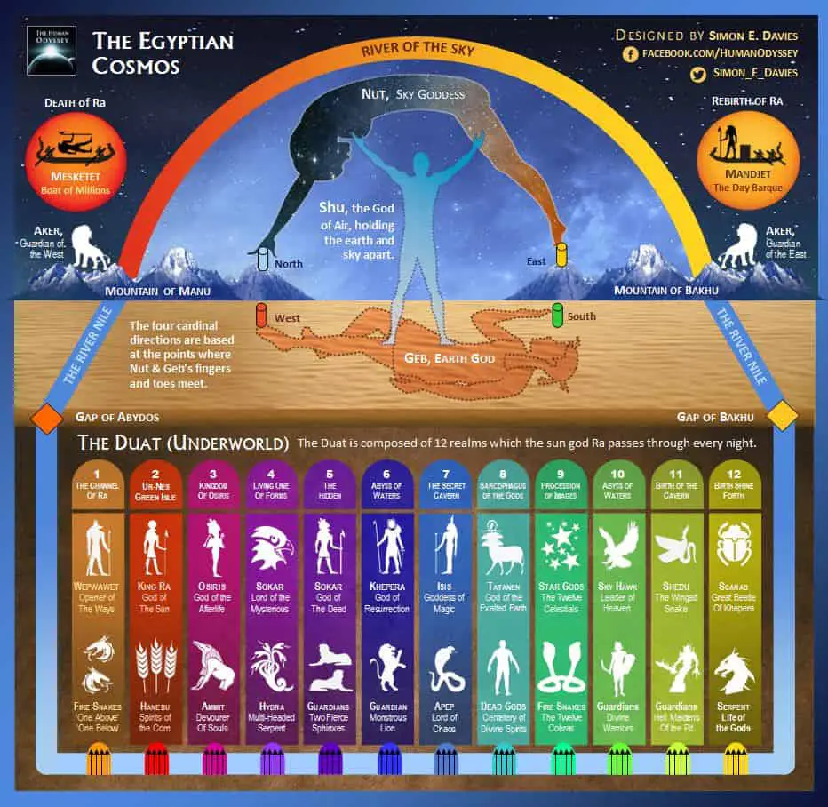 The Egyptian cosmos is separated into two parts. The upper region consists of the earth (Geb), atmosphere (Shu) and heavens (Nut). Nut and Geb are lovers, but Shu must hold