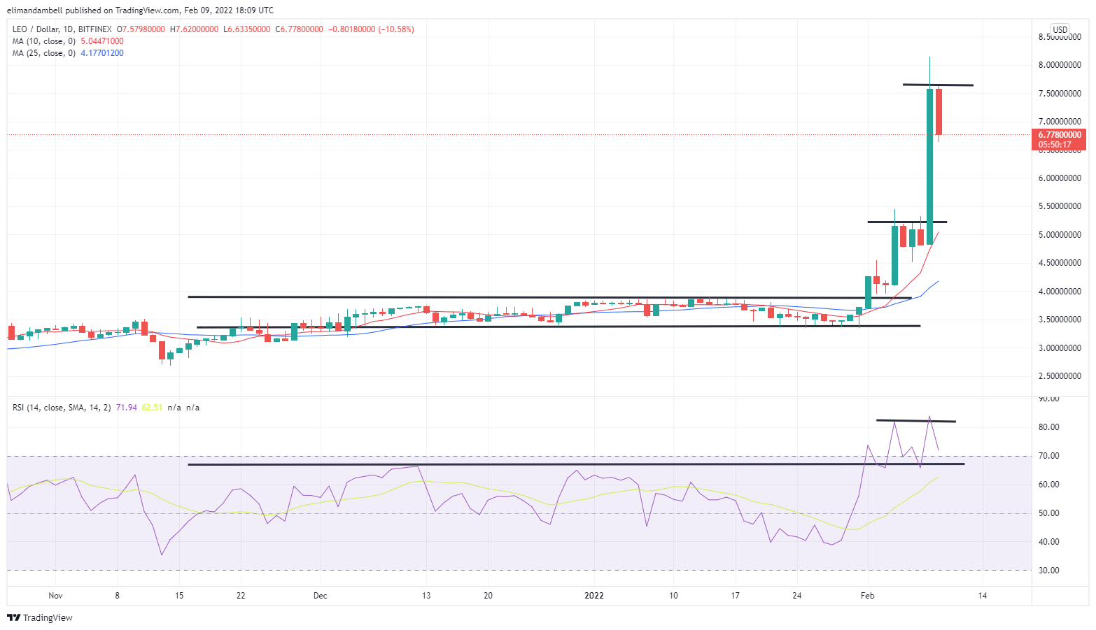 LEO/USD, which hit a high of $7.70 on Tuesday, fell to an intraday low of $6.68 during the course of today’s session.